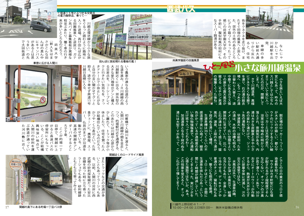 ■川越界隈:川越駅―ココも寄りたい:ラーメンショップでん―小さな旅―的場…入間川砂利採取線…ラーショM…うどんK…ラーショY…海洋センター―蔵の湯…日本セメント専用線…武蔵野うどんG…一本松駅―ラーショT―坂戸駅南口…坂戸砂利採取線…ふるさとの湯
